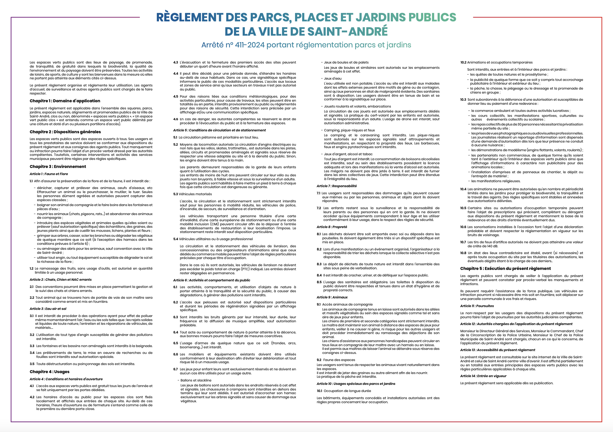 Voir la réglementation sur les parcs, places et jardins publics de la ville de Saint-André :